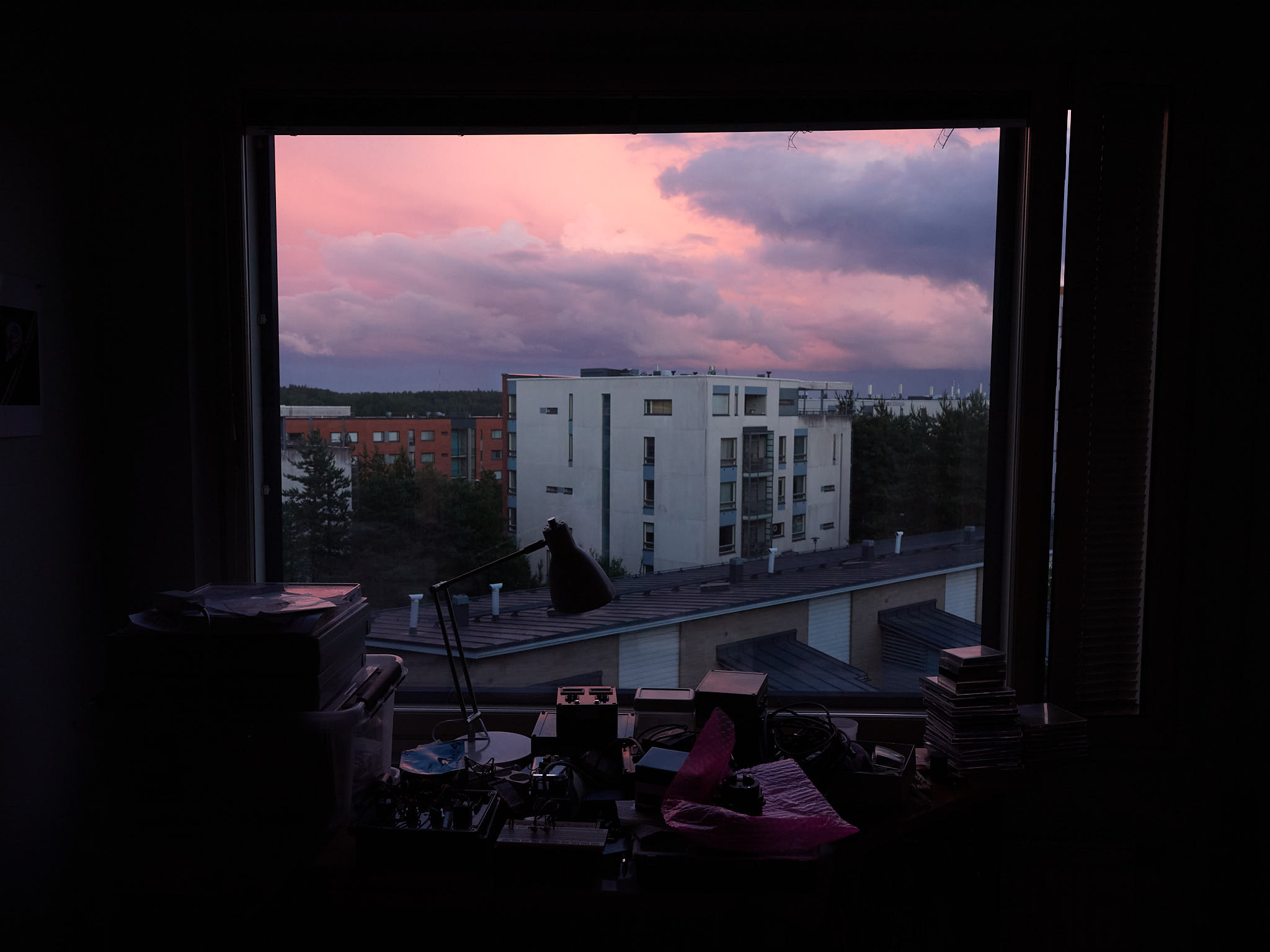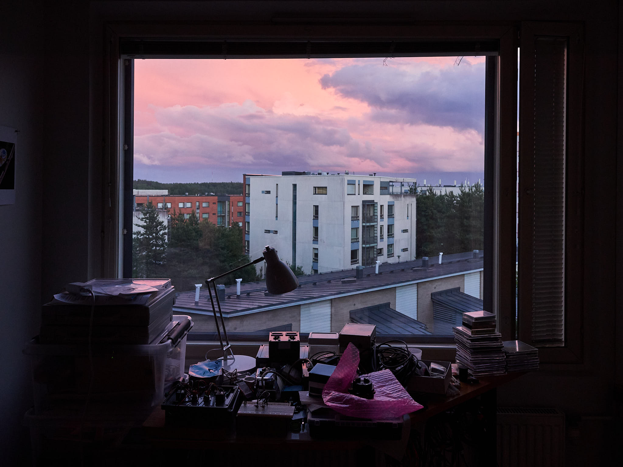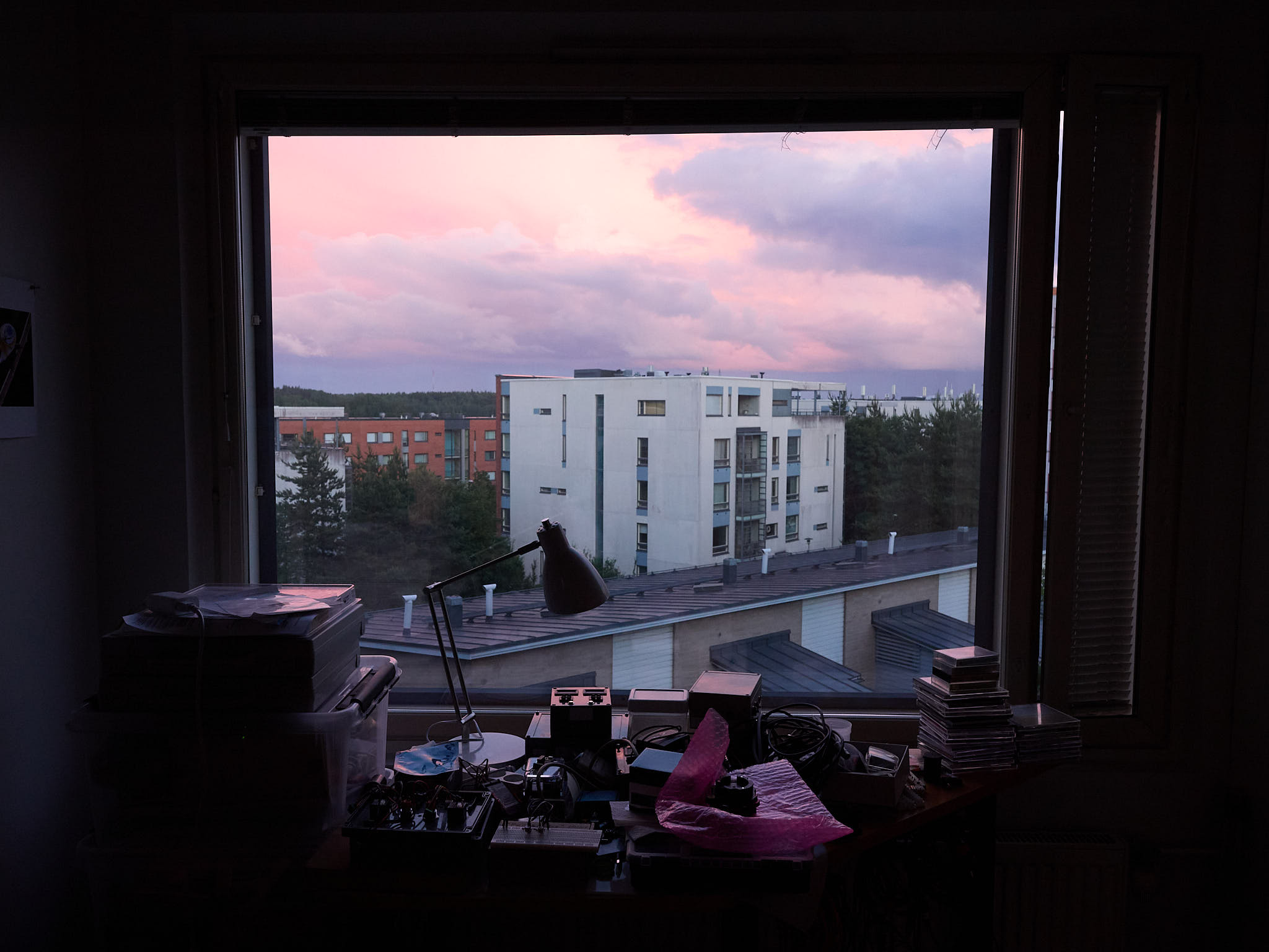 Exposure bracketing followed by “HDR” image merging can be used to increase the dynamic range, i.e., increase the range between the brightest and darkest luminosity values in the scene that can be recorded reliably in a photograph. In the example in Figure 2 the scene was dark and I had to use a rather small aperture (f:5.6) to ensure that both the distant landscape and the room would remain in focus. The luminosity range was broad but not extreme, so to avoid use of an extremely high ISO value I bracketed by only \(\pm 1\) EV. The three images without edits clearly differ in the bright sky outdoors and darkest shade inside the room.