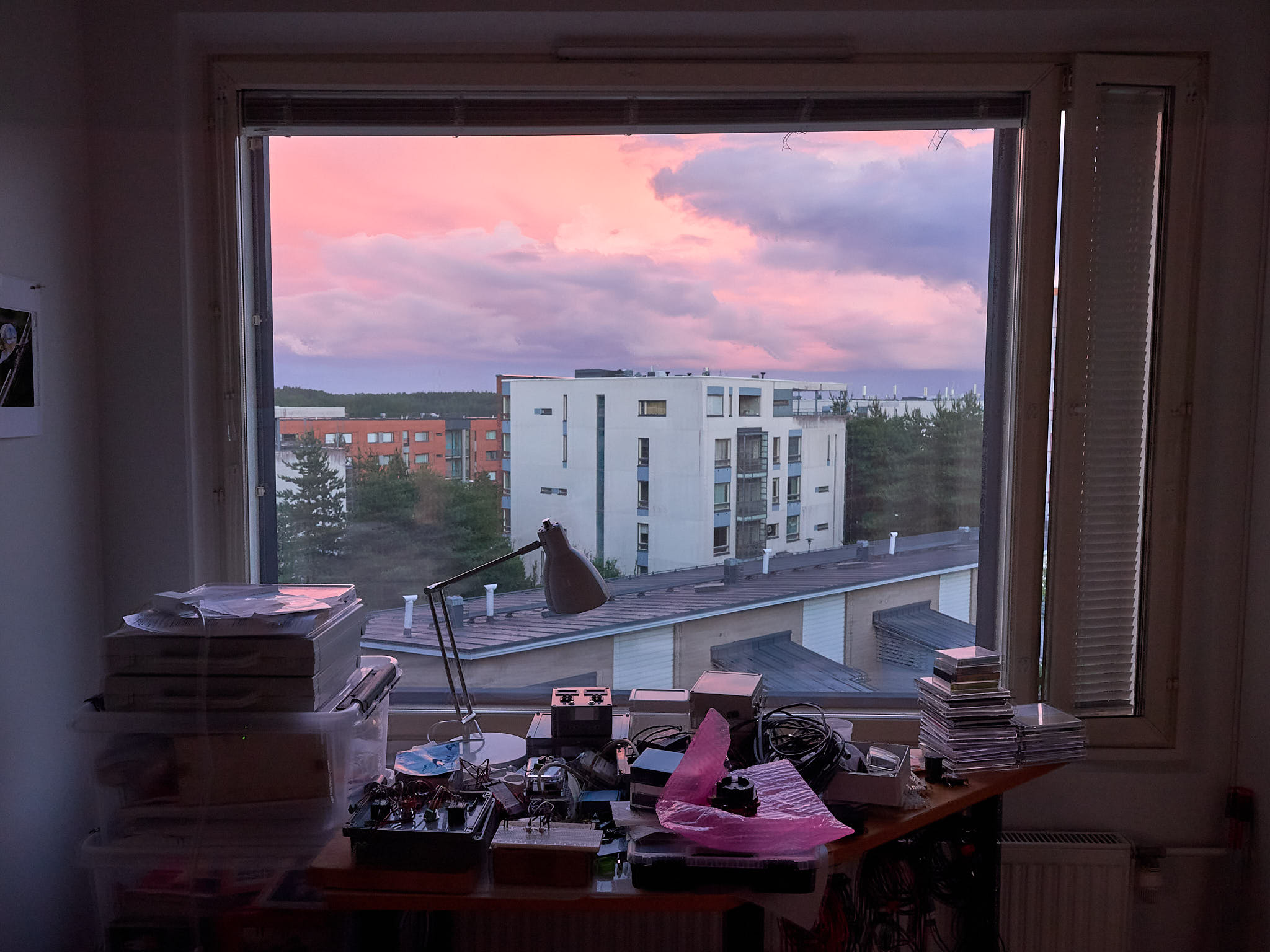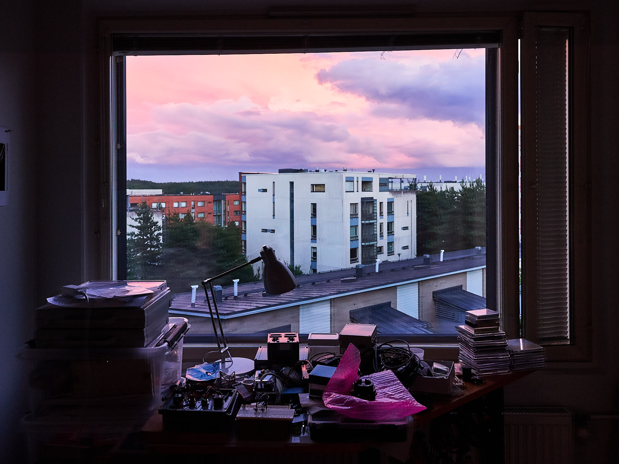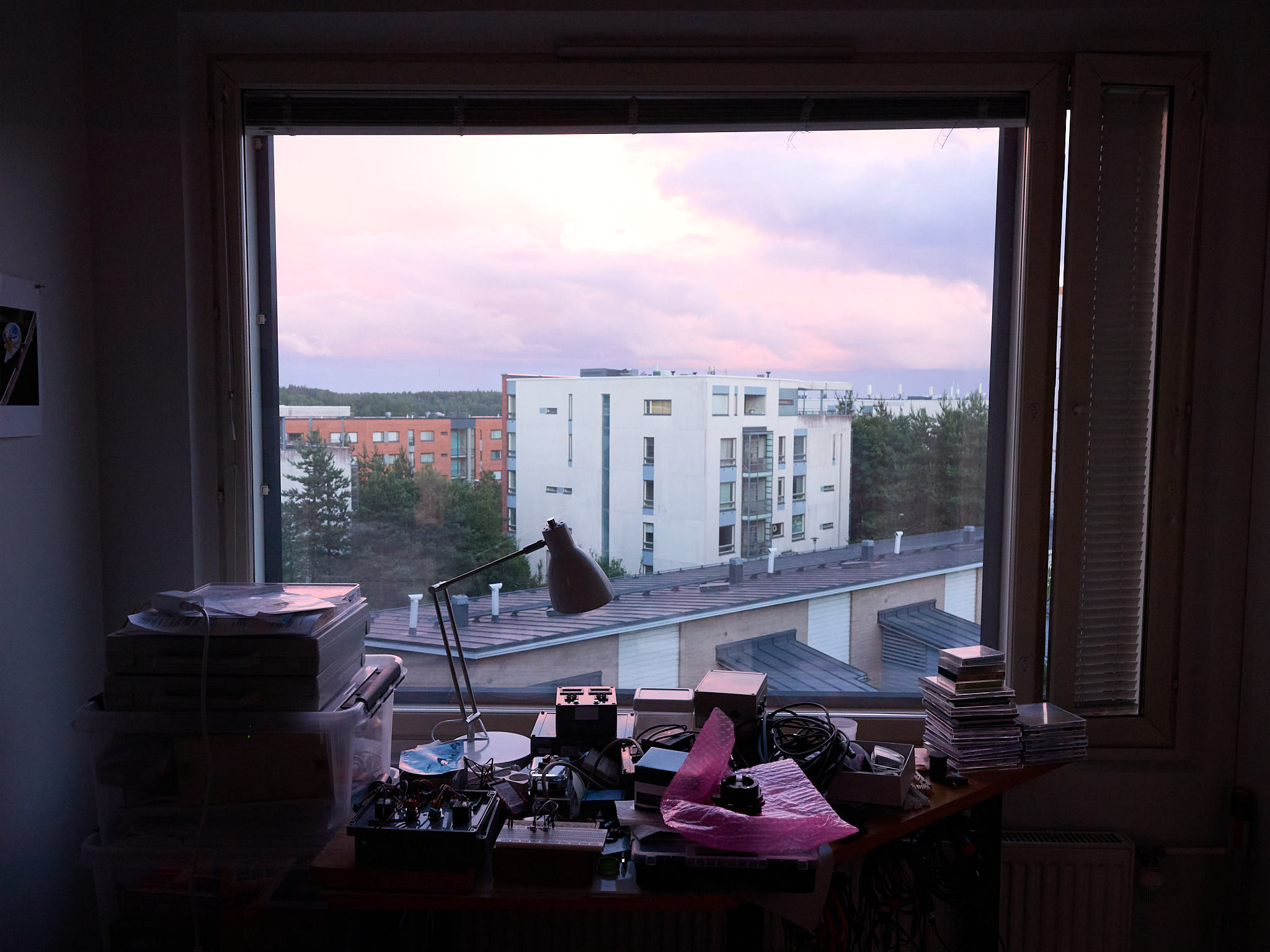 Exposure bracketing followed by “HDR” image merging can be used to increase the dynamic range, i.e., increase the range between the brightest and darkest luminosity values in the scene that can be recorded reliably in a photograph. In the example in Figure 2 the scene was dark and I had to use a rather small aperture (f:5.6) to ensure that both the distant landscape and the room would remain in focus. The luminosity range was broad but not extreme, so to avoid use of an extremely high ISO value I bracketed by only \(\pm 1\) EV. The three images without edits clearly differ in the bright sky outdoors and darkest shade inside the room.