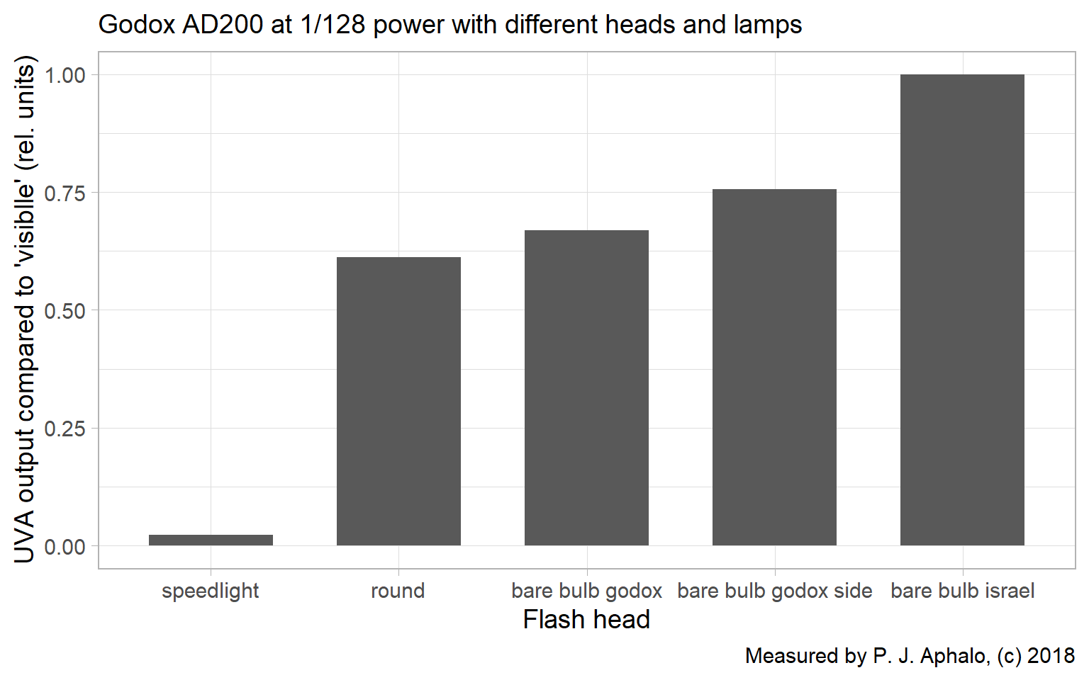 ggplot(flash_heads.tb, aes(`Flash head`, `UVA:PAR[q:q]`/max(`UVA:PAR[q:q]`))) +geom_col(width =0.66) +labs(subtitle ="Godox AD200 at 1/128 power with different heads and lamps",caption ="Measured by P. J. Aphalo, (c) 2018",y ="UVA output compared to 'visiblle' (rel. units)") -> uva_vis_ratios.figuva_vis_ratios.fig