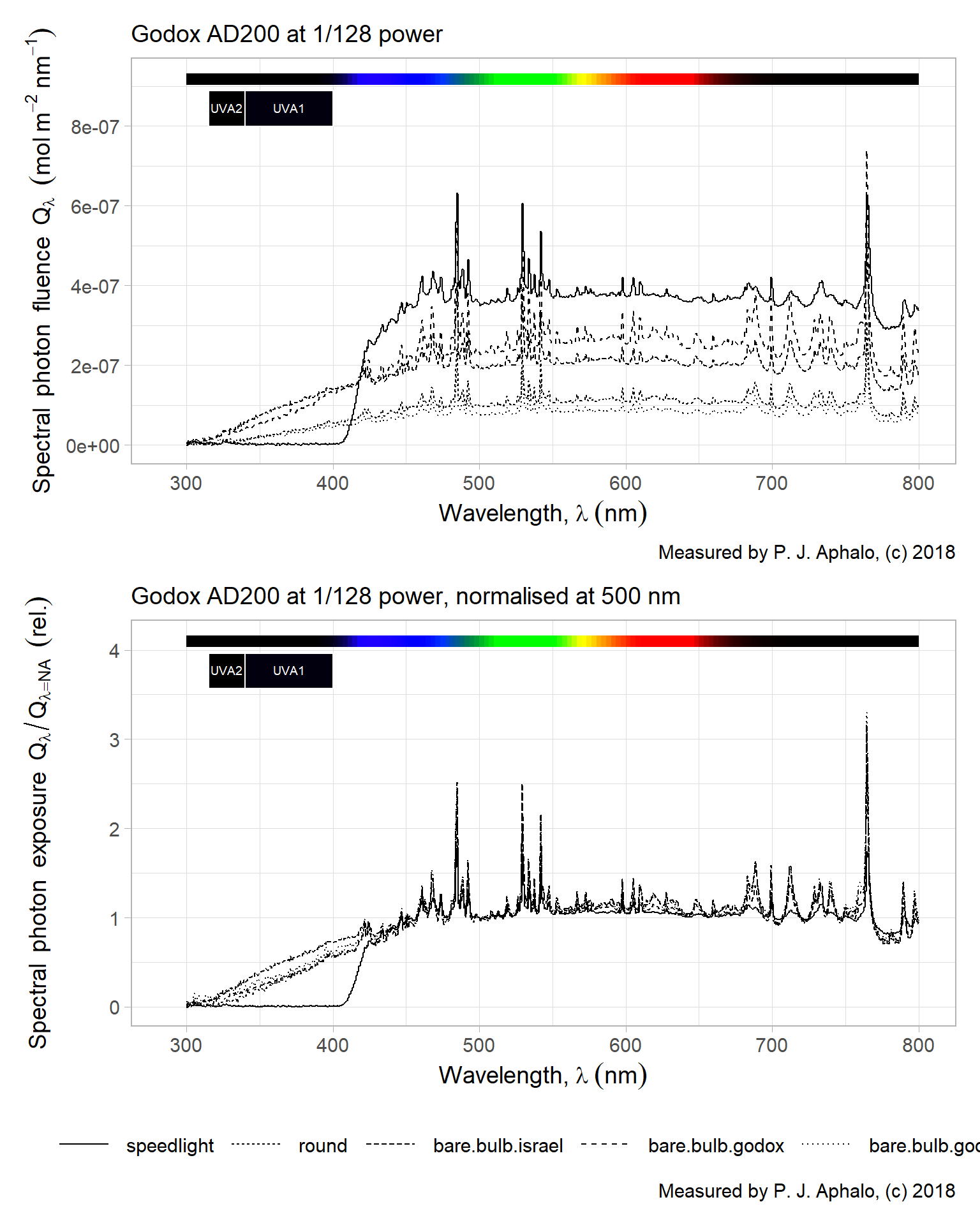 autoplot(Godox.AD200.heads.fluence.mspct[spct.names],range =c(300, 800),span =101,label.qty ="relative.pc",w.band =list(UVA1(), UVA2()),annotations =c("-", "peaks")) +scale_linetype_discrete(name ="", labels =function(x) {gsub(".1.128.spct", "", x, fixed =TRUE)}) +labs(subtitle ="Godox AD200 at 1/128 power",caption ="Measured by P. J. Aphalo, (c) 2018") -> AD200_H200.figautoplot(normalize(Godox.AD200.heads.fluence.mspct[spct.names], norm =500),range =c(300, 800),span =101,label.qty ="relative.pc",w.band =list(UVA1(), UVA2()),annotations =c("-", "peaks")) +scale_linetype_discrete(name ="", labels =function(x) {gsub(".1.128.spct", "", x, fixed =TRUE)}) +labs(subtitle ="Godox AD200 at 1/128 power, normalised at 500 nm",caption ="Measured by P. J. Aphalo, (c) 2018") -> AD200_H200_norm.figAD200_H200.fig / AD200_H200_norm.fig +plot_layout(guides ="collect") &theme(legend.position='bottom')