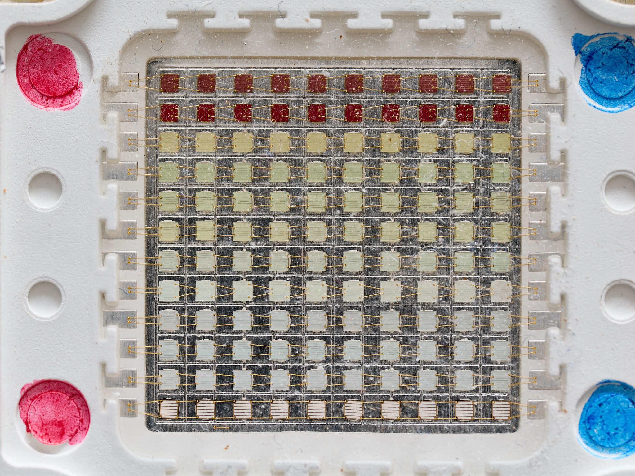 Custom LED array from Weilli light emitting area size $20\times 22\,\mathrm{mm}$ mounted on PCB. The 120 chips can be seen as well as the wiring. The wavelength increases from bottom to top from 365 nm to 660 nm nominal.