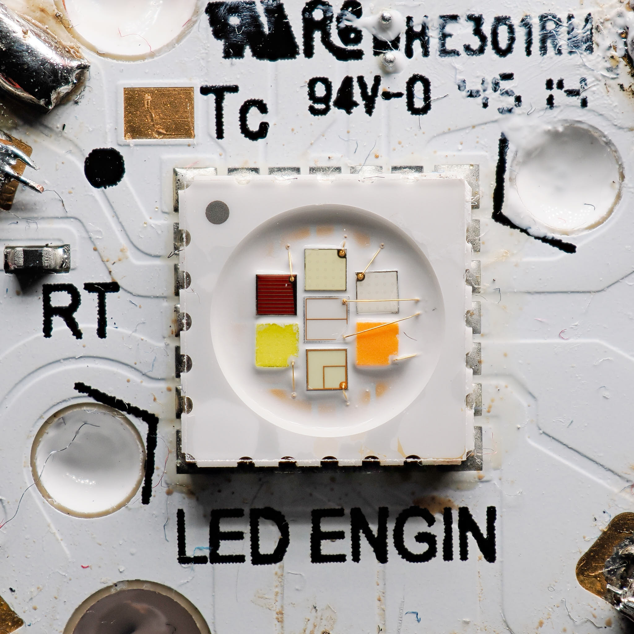 Ledengin Osram LZ7-N4M100 7-channel LED array from 2018 or so: six colours + white. Max 20 W total. It has a flat glass window protecting the chips. LES 3.8 mm (all chips are within a 3.8 mm diameter area (@fig-lz7). Maximum rated current per channel is 700 mA. For the photographs below current was set to 350 mA, the maximum for the driver used.