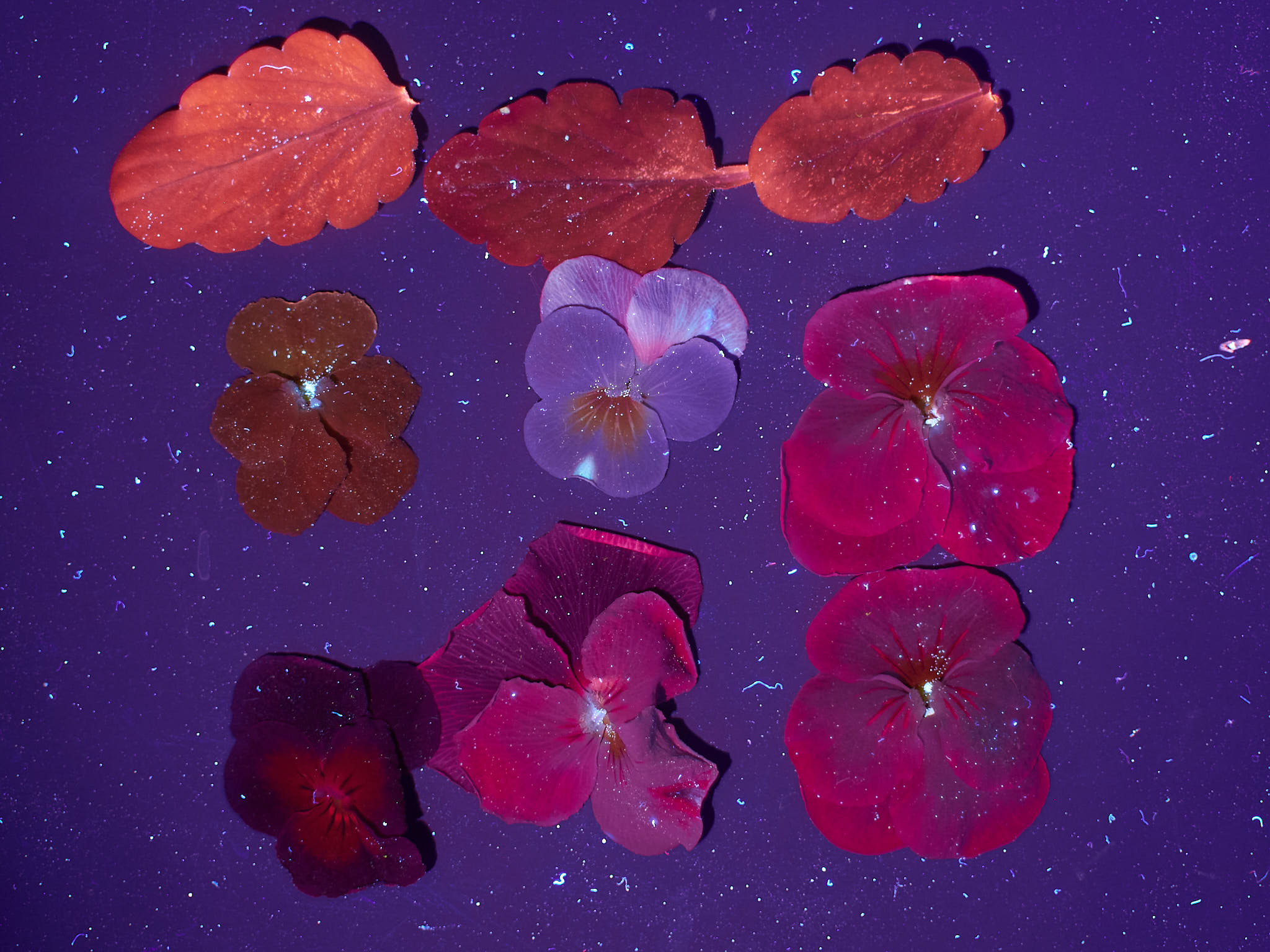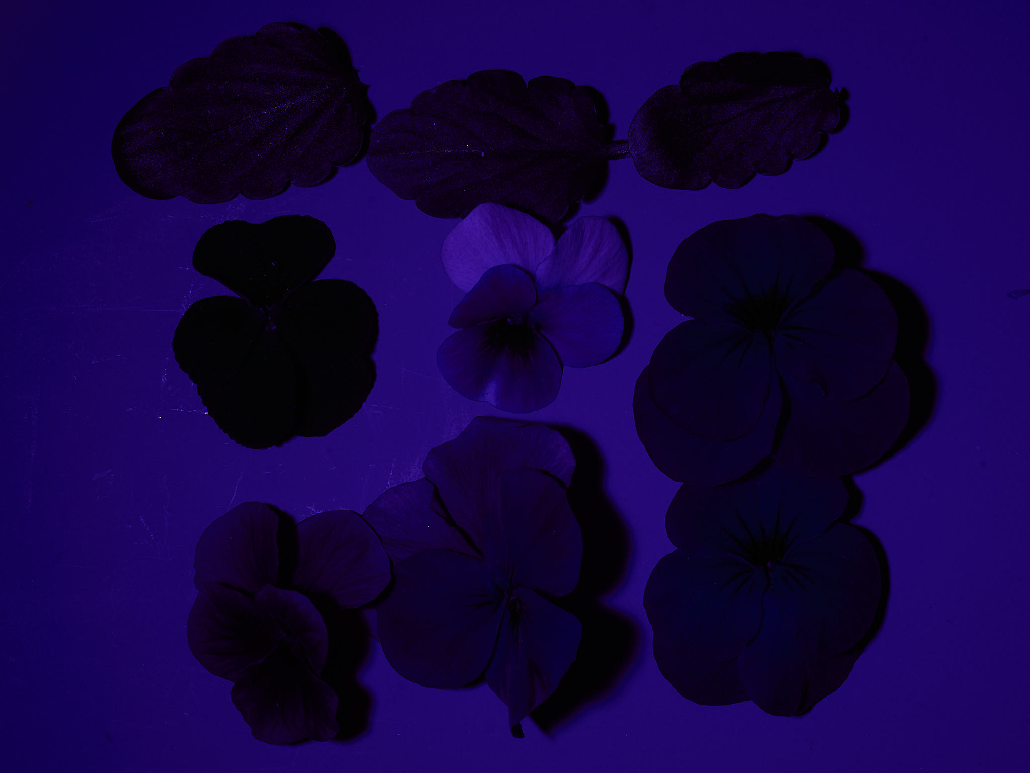 Here I show a photograph of the same set-up of flowers and leaves illuminated with a well-filtered UV-A LED flashlight (@fig-UVIVF)