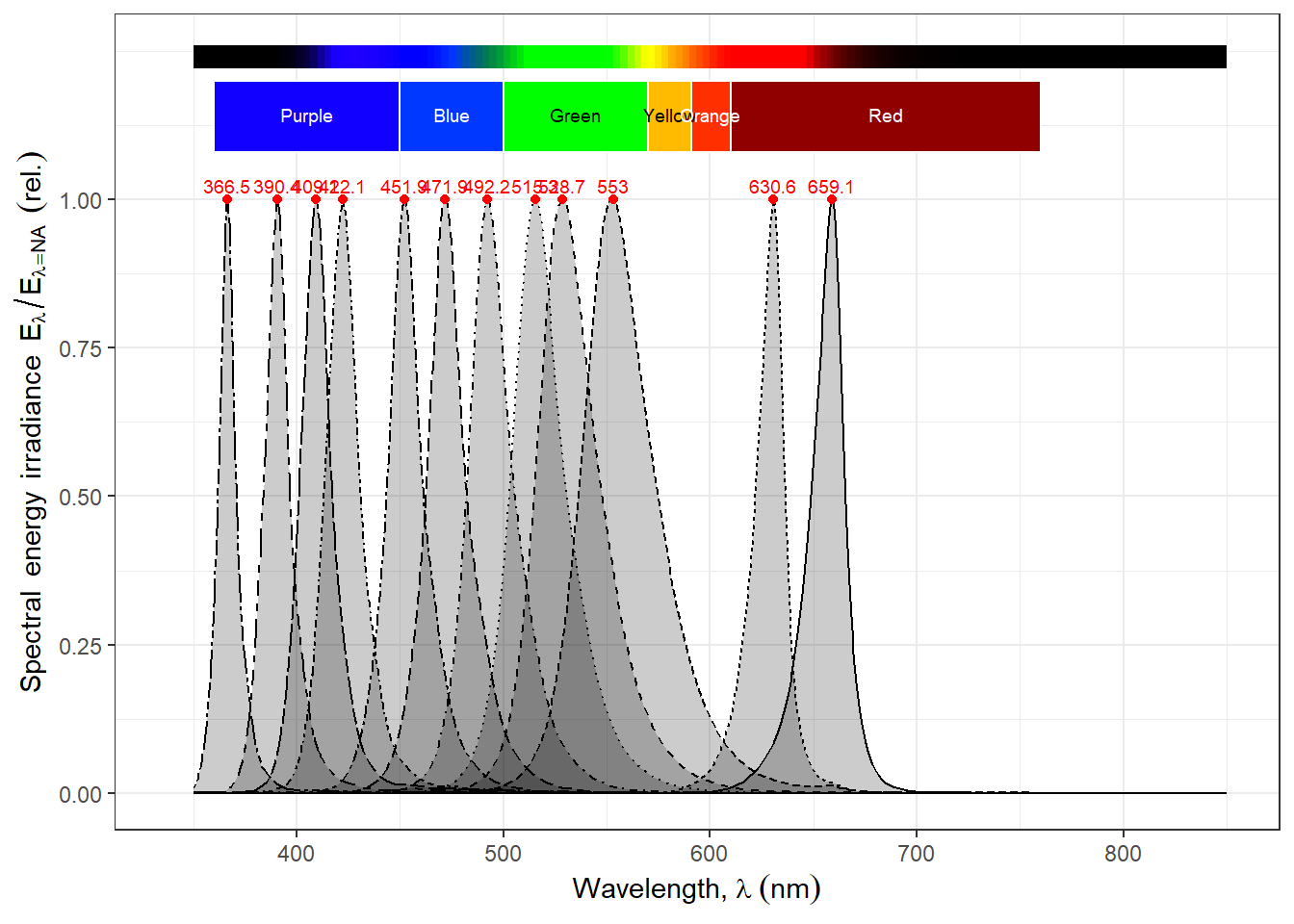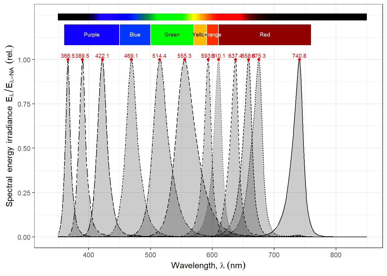 #| fig-cap: Emission spectra of the 12 channels of the custom assembled led array.