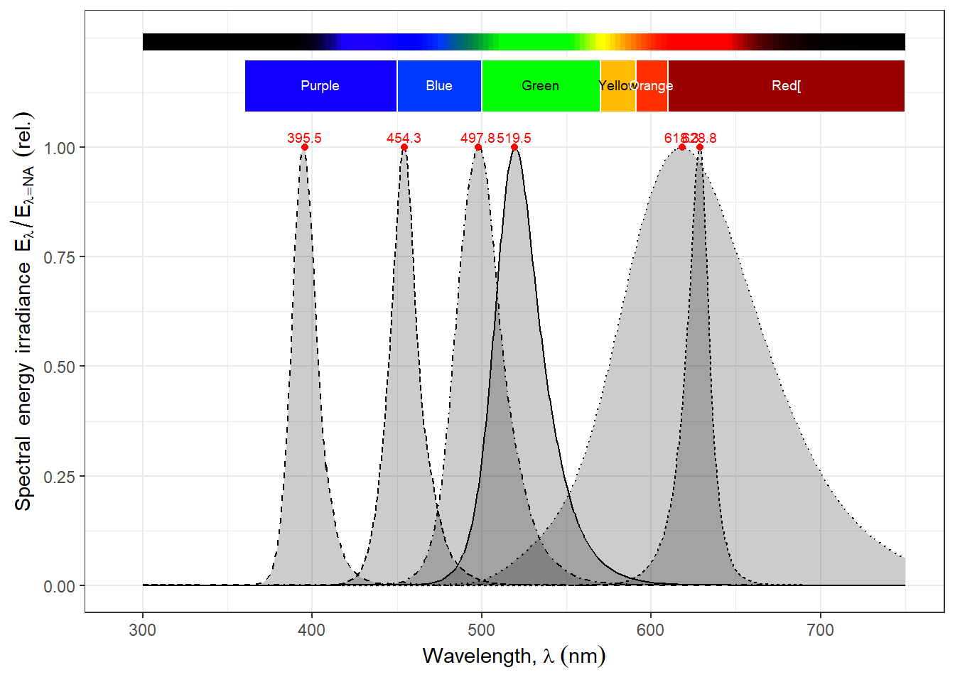 #| fig-cap: Emission spectra of the 6 "single-colour" channels of the led array type LZ7-N4M100 from Led Engin (now Osram). Spectral irradiance is normalized to the maximum of each spectrum.