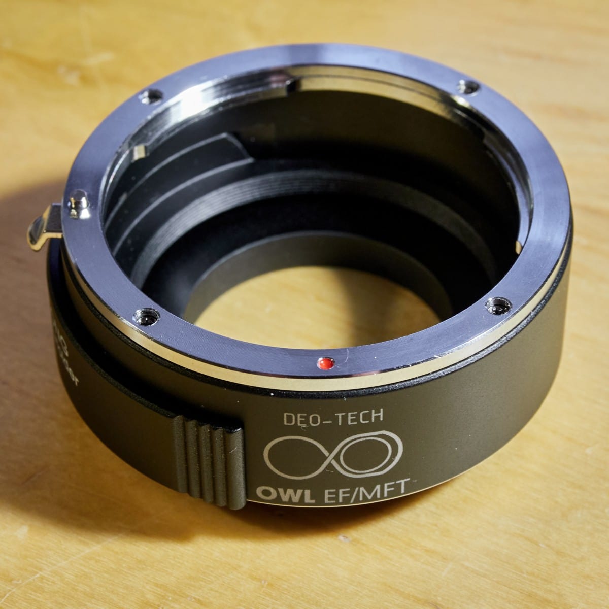 I also measured the flange-to-flange distance of the “DEO-TECH OWL EF/MFT” adapter I described recently: exactly 24.75 mm. This adapter measures correct to the 0.01 mm resolution of the digital callipers I used. With no filter in the adapter, when focusing the same lenses as tested with the K&F adapter, the focusing scales show the correct distances.